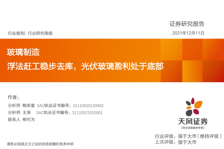 【天风证券】【20211211】玻璃制造行业研究周报:浮法赶工稳步去库,光伏玻璃盈利处于底部-19页
