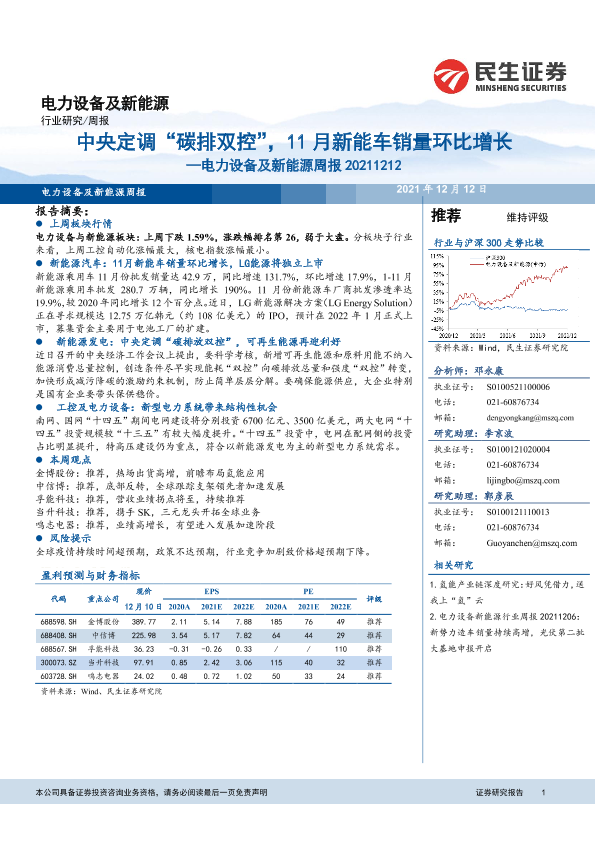 【民生证券】【20211212】电力设备及新能源周报:中央定调“碳排双控”,11月新能车销量环比增长-25页