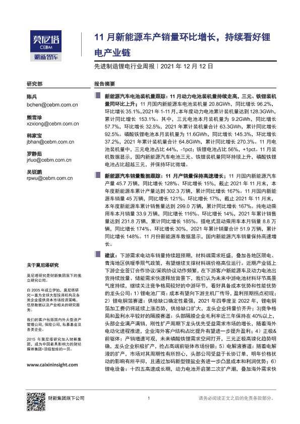 【莫尼塔研究】【20211212】先进制造锂电行业周报:11月新能源车产销量环比增长,持续看好锂电产业链-14页