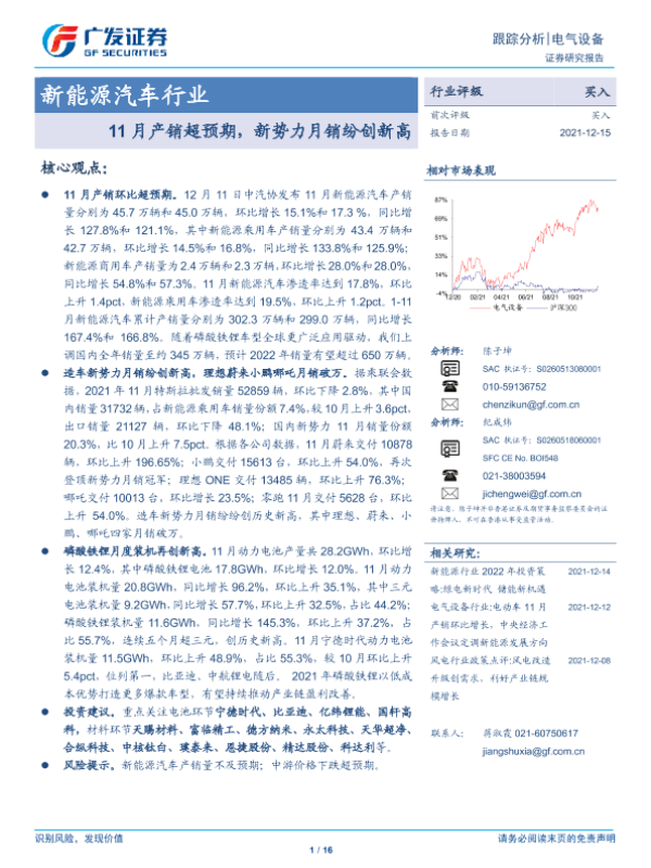 【广发证券】【20211215】20211215-广发证券-新能源汽车行业跟踪分析:11月产销超预期,新势力月销纷创新高-16页