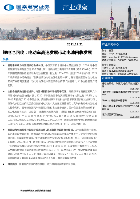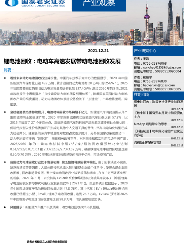 【国泰君安证券】【20211221】锂电池回收:电动车高速发展带动电池回收发展-11页