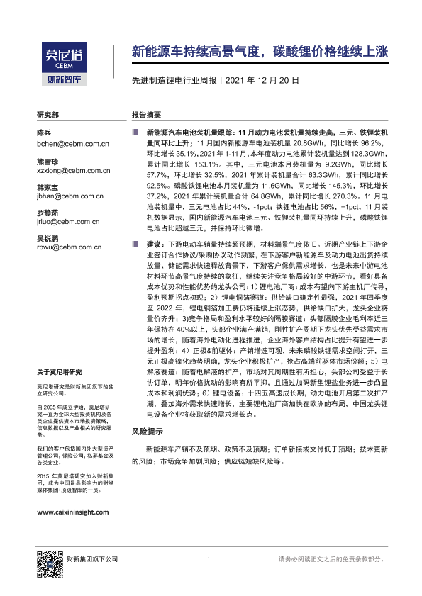 【莫尼塔研究】【20211220】先进制造锂电行业周报:新能源车持续高景气度,碳酸锂价格继续上涨-13页