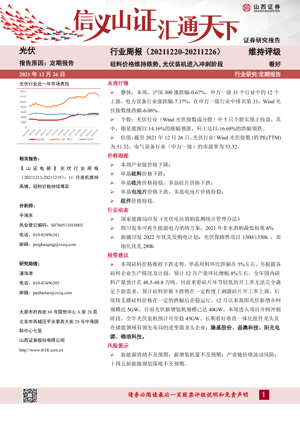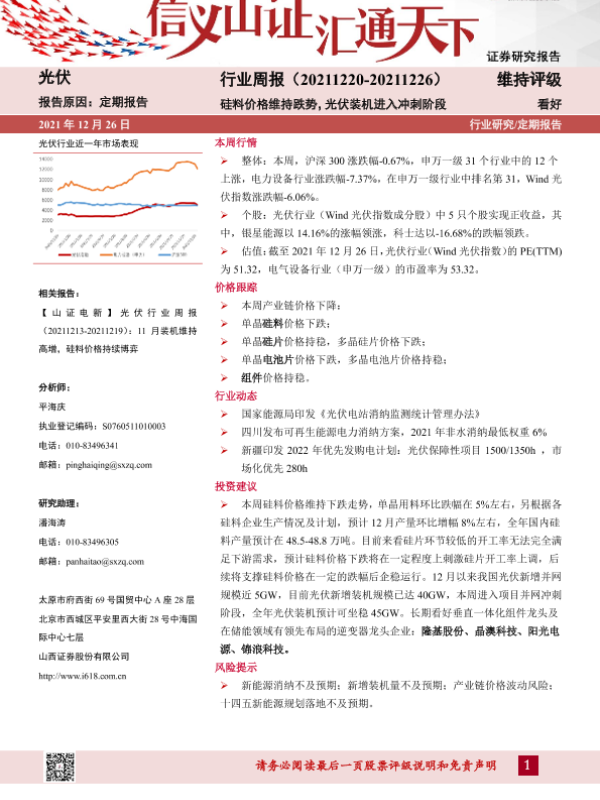 【山西证券】【20211226】20211226-山西证券-光伏行业周报:硅料价格维持跌势,光伏装机进入冲刺阶段-11页