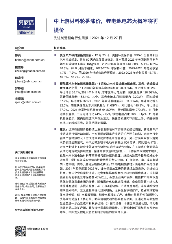 【莫尼塔研究】【20211227】先进制造锂电行业周报:中上游材料轮番涨价,锂电池电芯大概率将再提价-14页