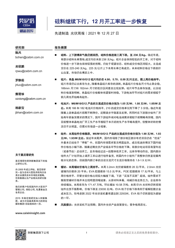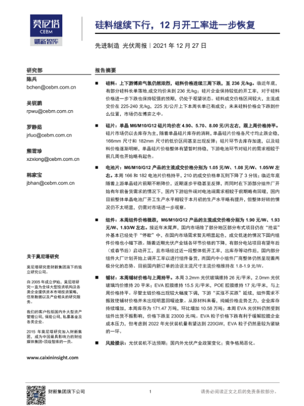 【莫尼塔研究】【20211227】20211227-莫尼塔投资-先进制造 光伏周报:硅料继续下行,12月开工率进一步恢复-17页