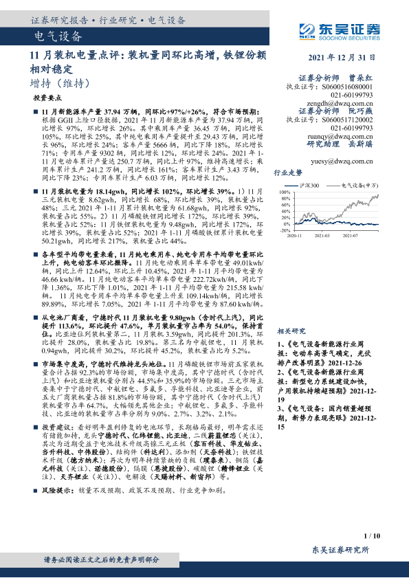 【东吴证券】【20211231】电气设备11月装机电量点评:装机量同环比高增,铁锂份额相对稳定-10页