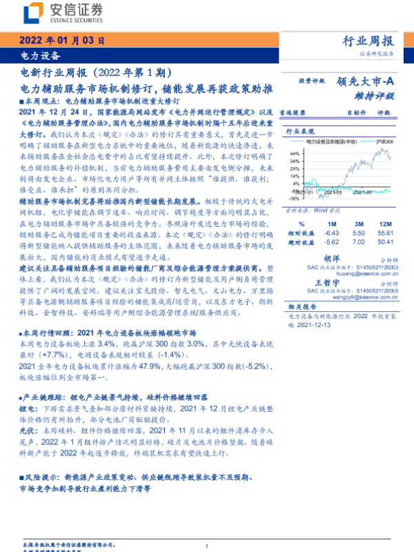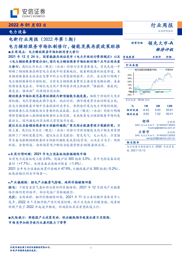 【安信证券】【20220103】电新行业周报(2022年第1期):电力辅助服务市场机制修订,储能发展再获政策助推-20页
