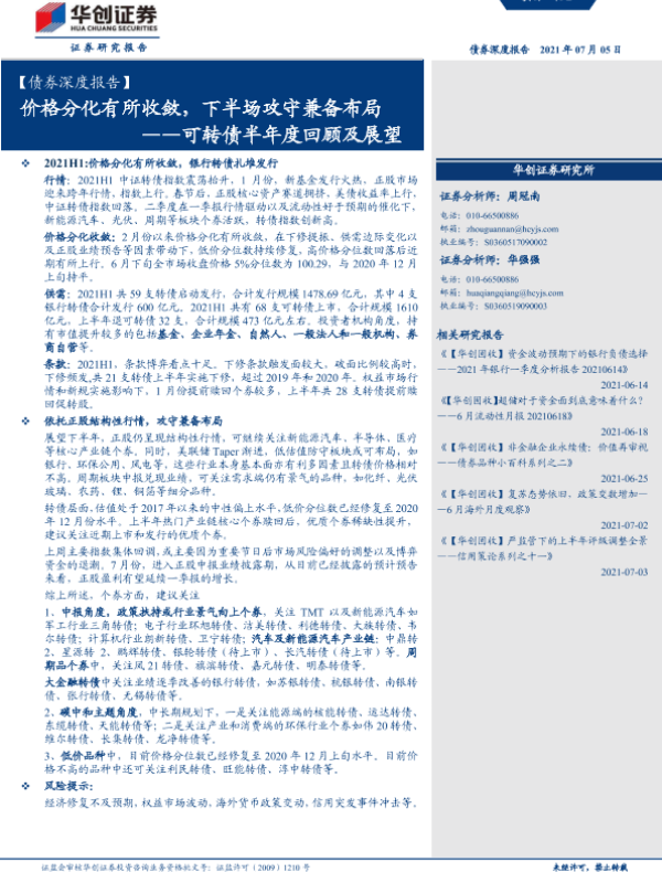 【华创证券】【20210705】可转债半年度回顾及展望:价格分化有所收敛,下半场攻守兼备布局-26页