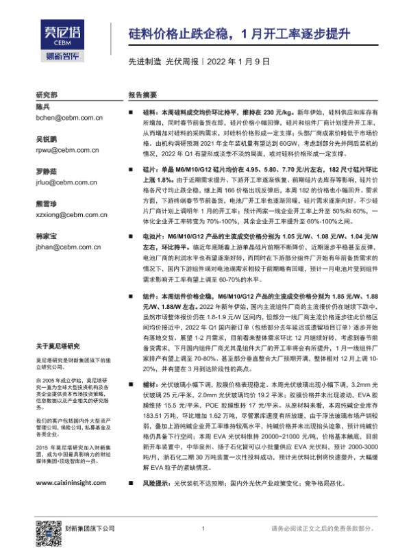 【莫尼塔研究】【20220109】光伏周报:硅料价格止跌企稳,1月开工率逐步提升-18页