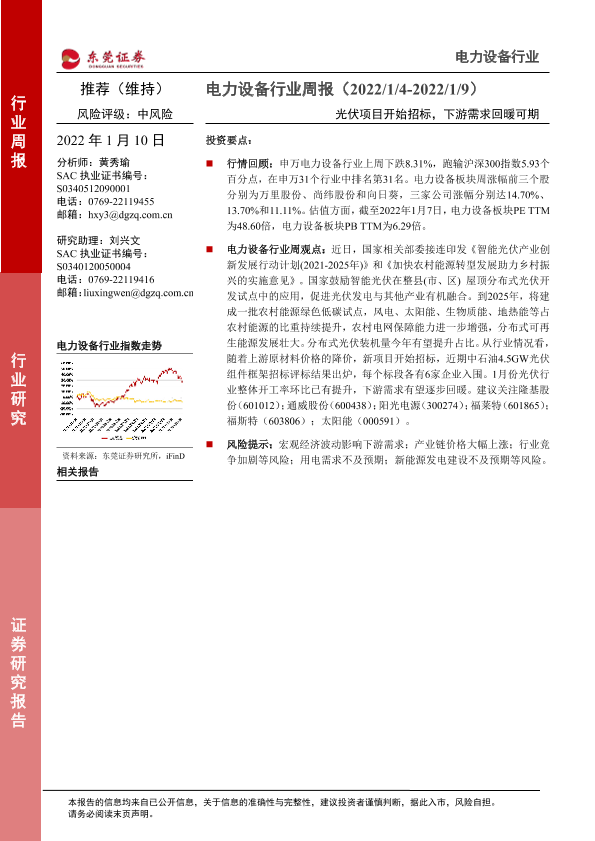 【东莞证券】【20220110】20220110-东莞证券-电力设备行业周报:光伏项目开始招标,下游需求回暖可期-13页