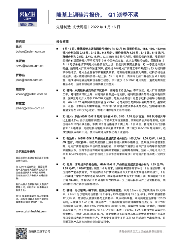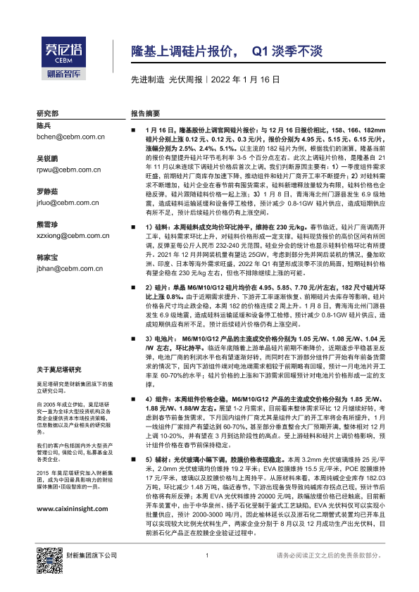 【莫尼塔研究】【20220116】先进制造光伏周报:隆基上调硅片报价,Q1淡季不淡-18页