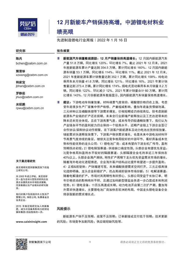 【莫尼塔研究】【20220116】先进制造锂电行业周:12月新能车产销保持高增,中游锂电材料业绩亮眼-12页