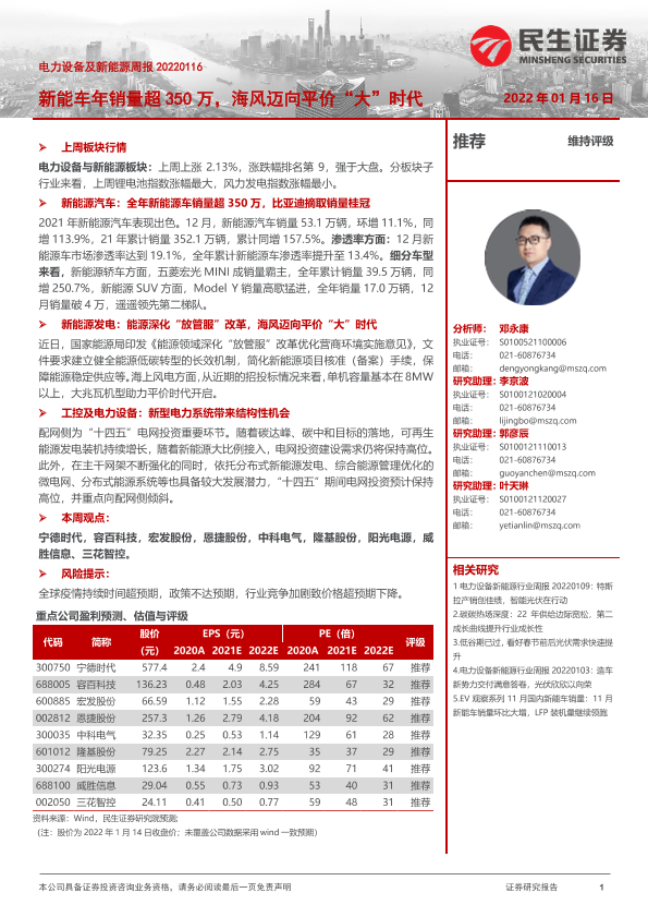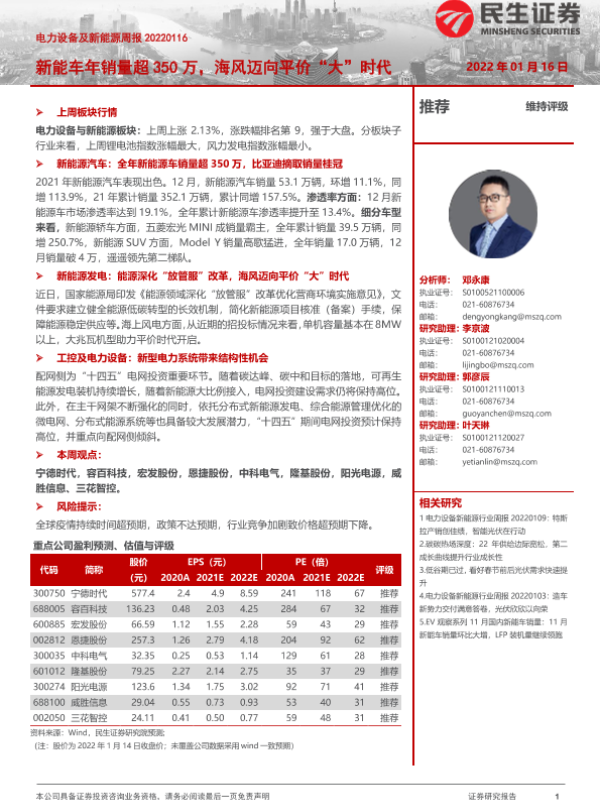 【民生证券】【20220116】电力设备及新能源周报:新能车年销量超350万,海风迈向平价“大”时代-27页