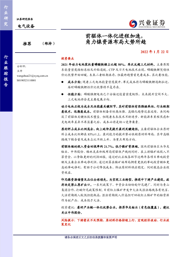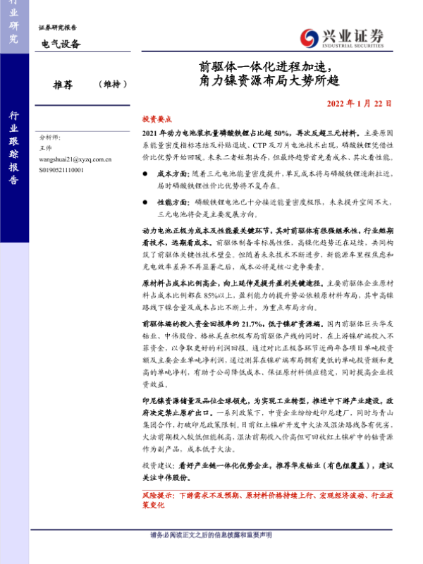 【兴业证券】【20220122】电气设备:前驱体一体化进程加速,角力镍资源布局大势所趋-23页