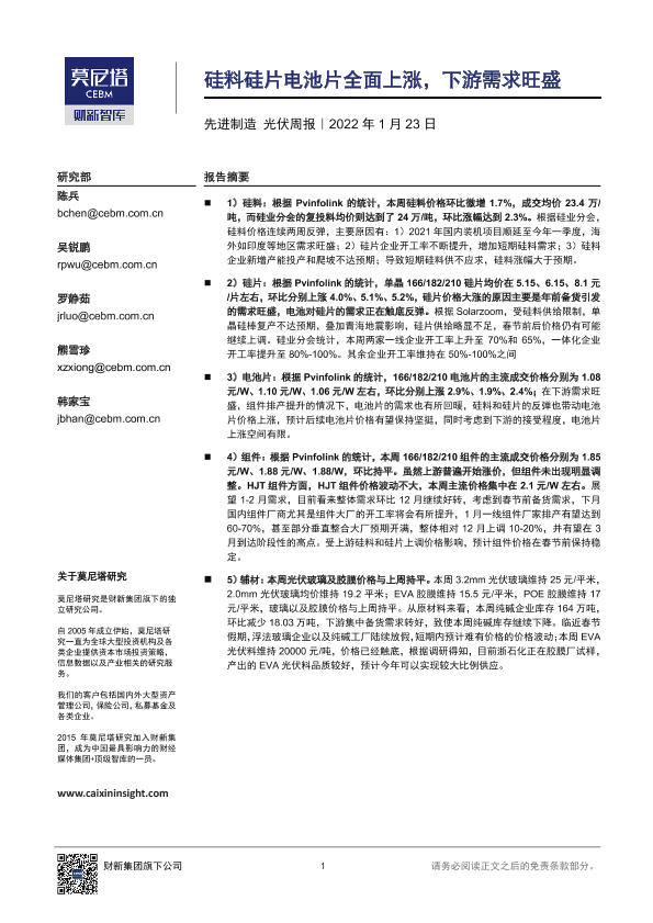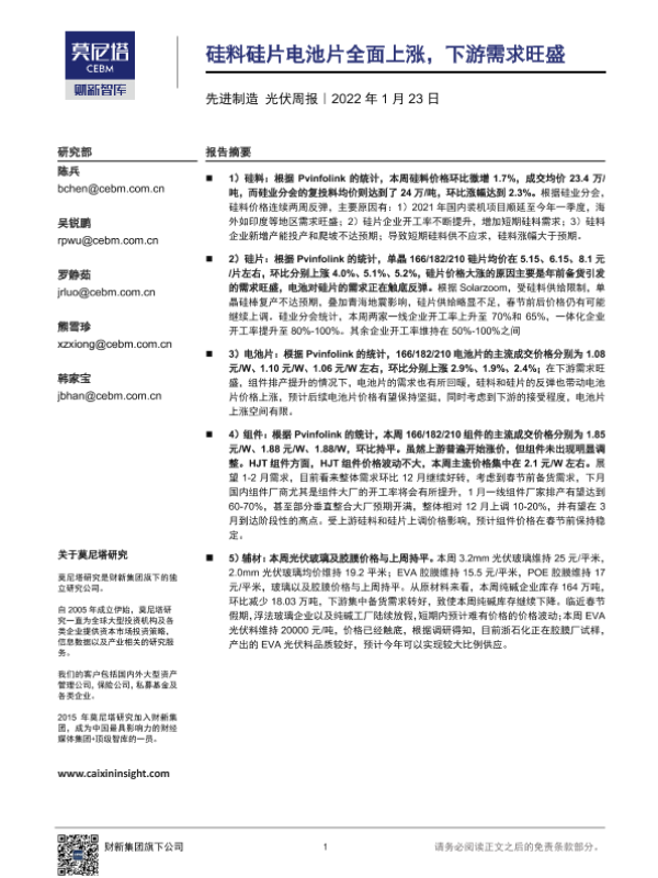 【莫尼塔研究】【20220123】光伏先进制造周报:硅料硅片电池片全线上涨,下游需求旺盛-17页