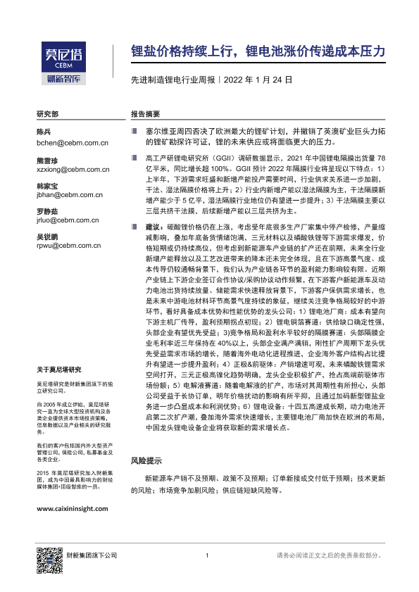 【莫尼塔研究】【20220124】20220124-莫尼塔投资-先进制造锂电行业周报:锂盐价格持续上行,锂电池涨价传递成本压力-12页