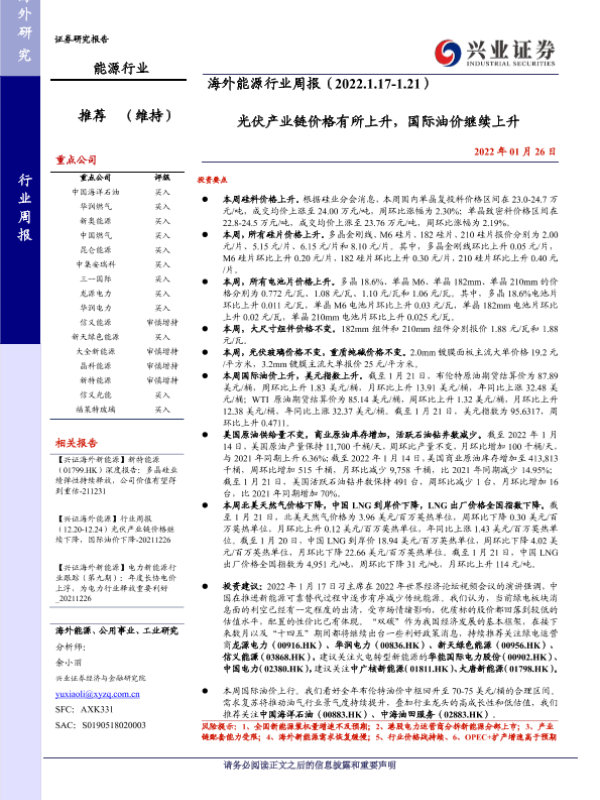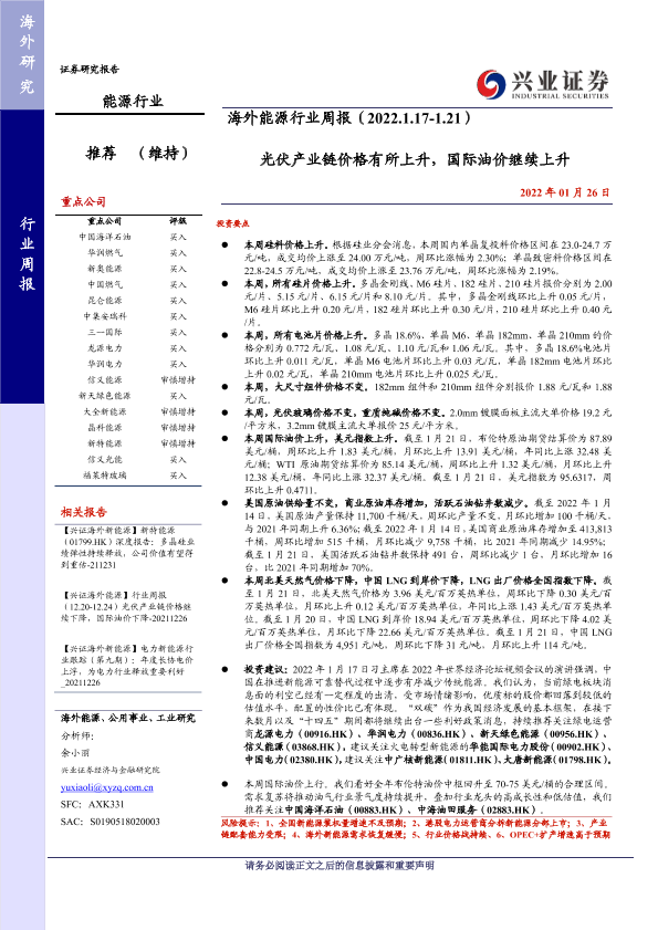 【兴业证券】【20220126】海外能源行业周报:光伏产业链价格有所上升,国际油价继续上升-14页