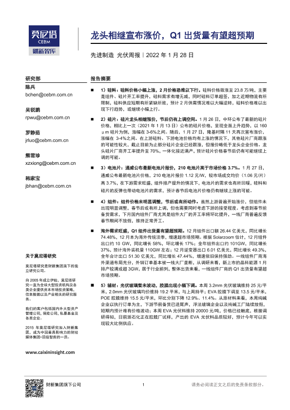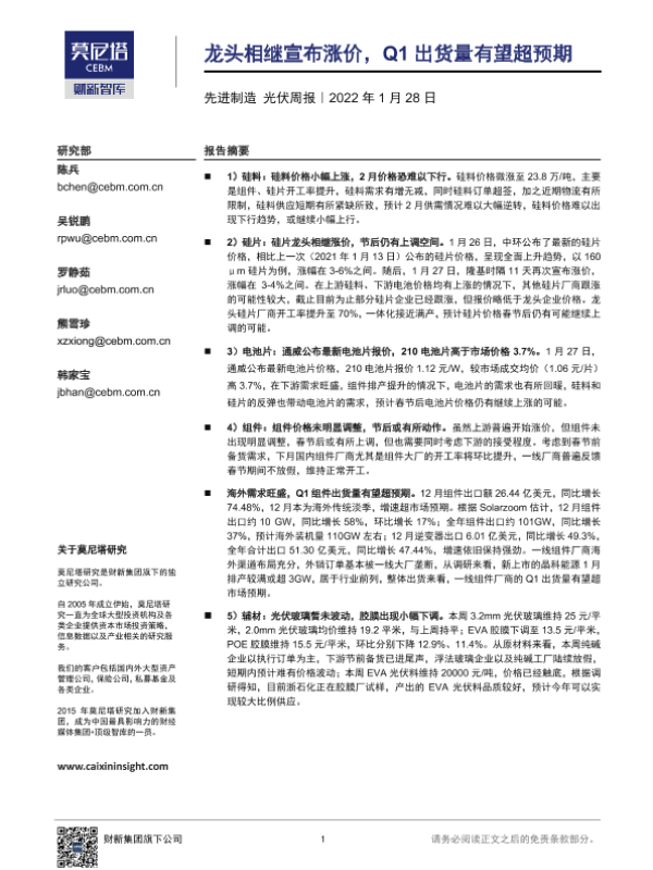 【莫尼塔研究】【20220128】先进制造光伏周报:龙头相继宣布涨价,Q1出货量有望超预期-17页
