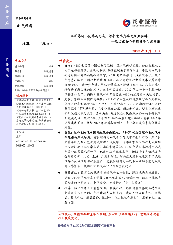 【兴业证券】【20220131】国补落地示范格局形成,燃料电池汽车迎来里程碑 —电力设备与新能源车行业周报-24页