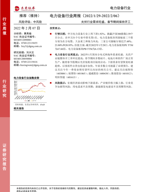 【东莞证券】【20220207】电力设备行业周报:光伏行业需求旺盛,春节期间保持开工-12页