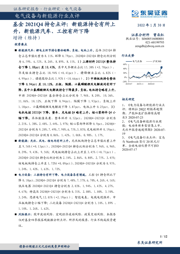 【东吴证券】【20220130】电气设备与新能源行业点评:基金2021Q4持仓点评:新能源持仓有所上升,新能源汽车、工控有所下降-12页