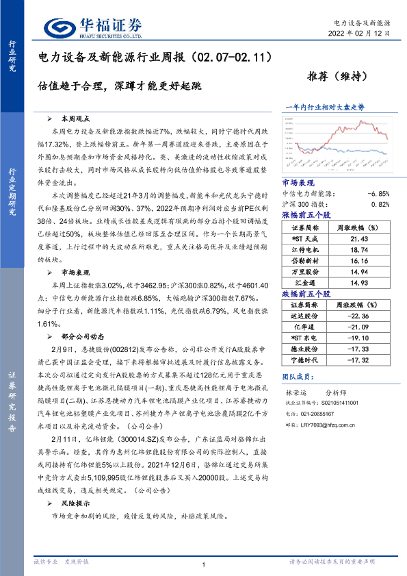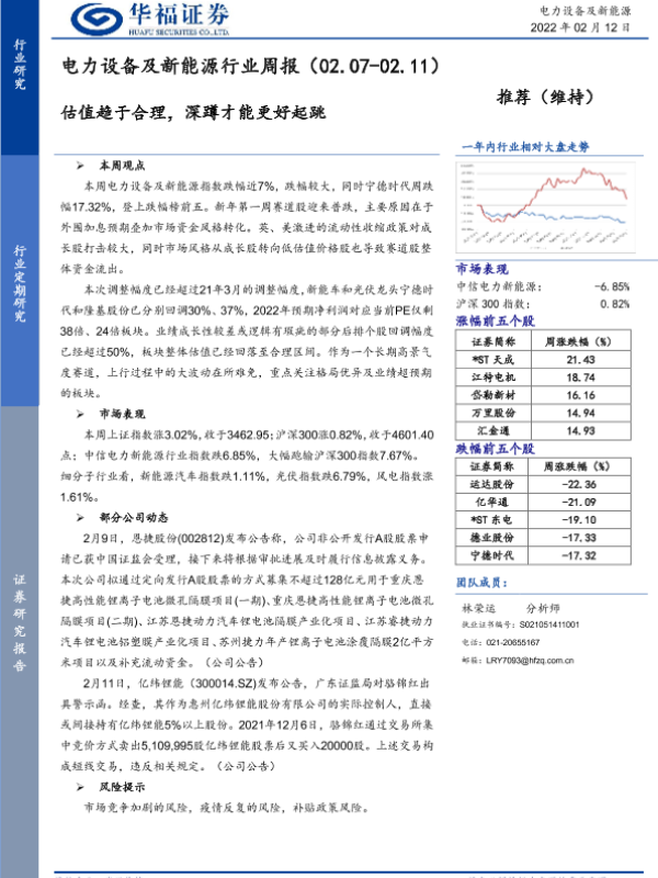 【华福证券】【20220212】电力设备及新能源行业周报:估值趋于合理,深蹲才能更好起跳-7页