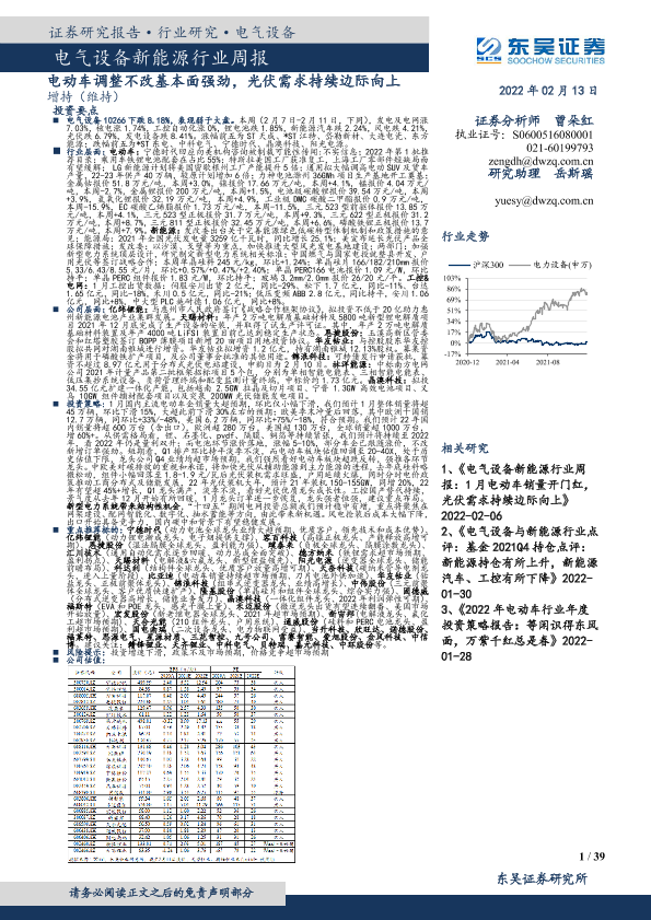 【东吴证券】【20220213】电气设备新能源行业周报:电动车调整不改基本面强劲,光伏需求持续边际向上-39页