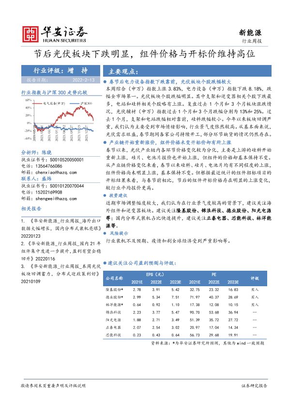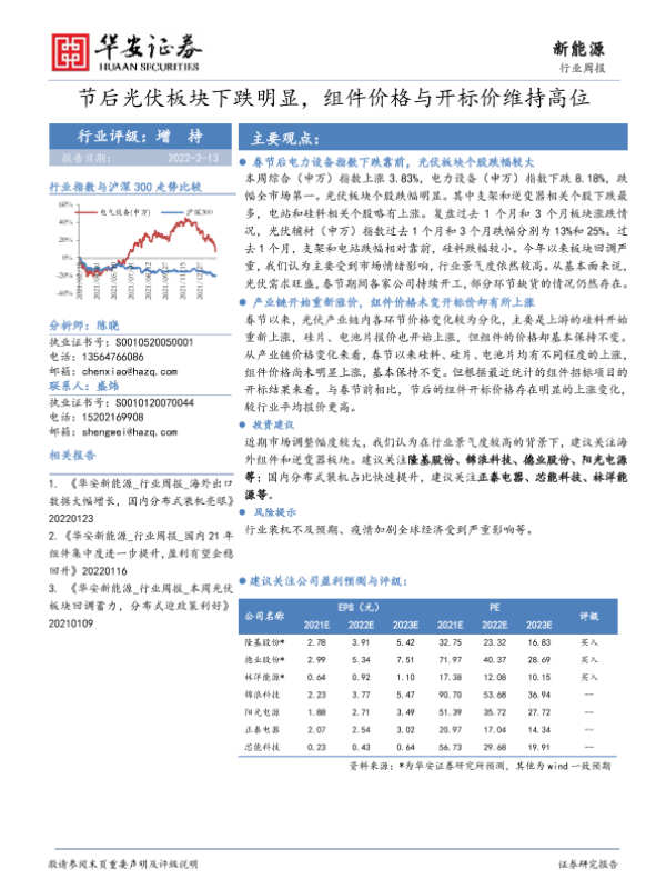 【华安证券】【20220213】20220213-华安证券-新能源行业周报:节后光伏板块下跌明显,组件价格与开标价维持高位-17页