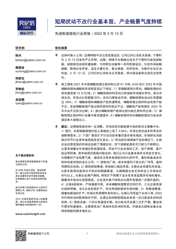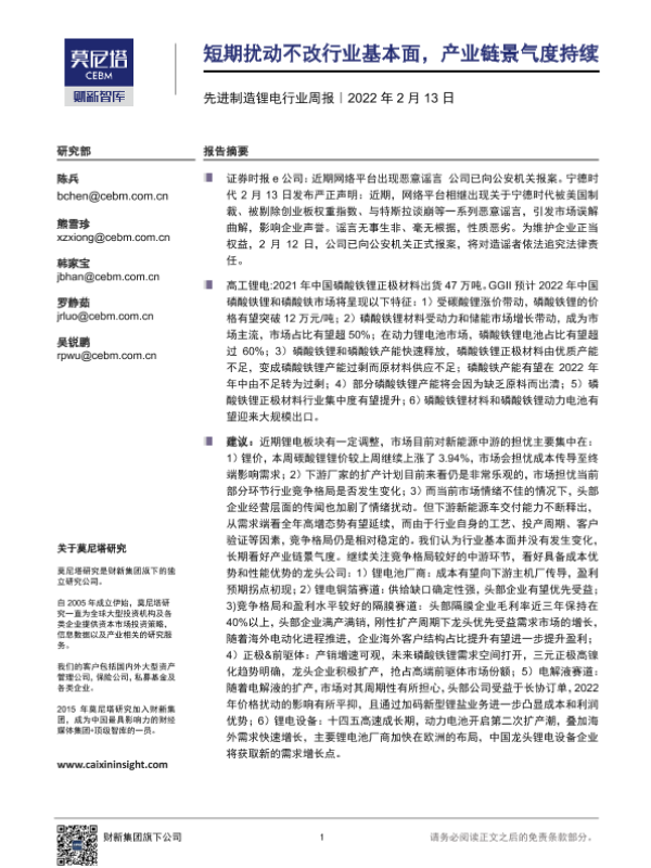 【莫尼塔研究】【20220213】先进制造锂电行业周报:短期扰动不改行业基本面,产业链景气度持续-12页