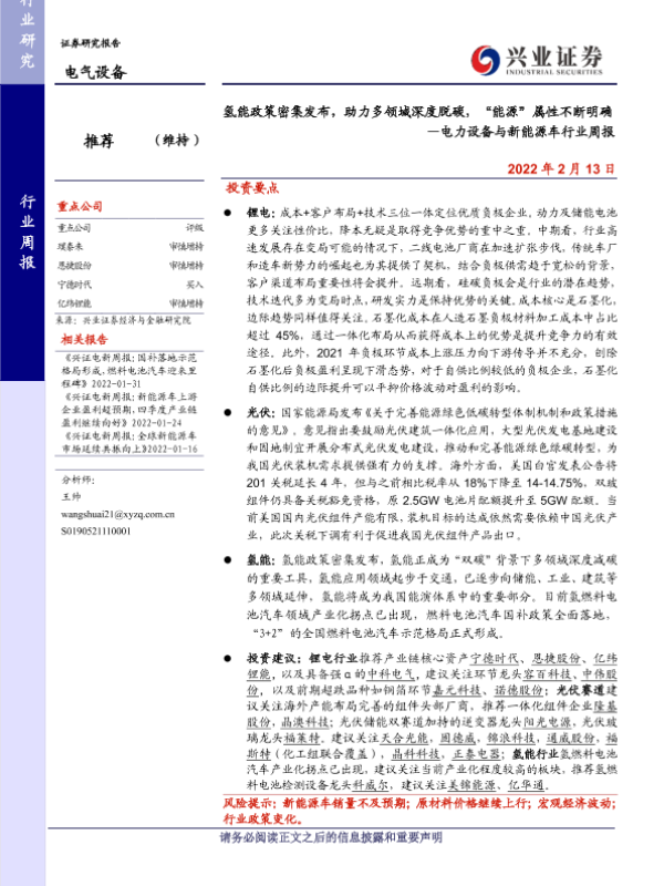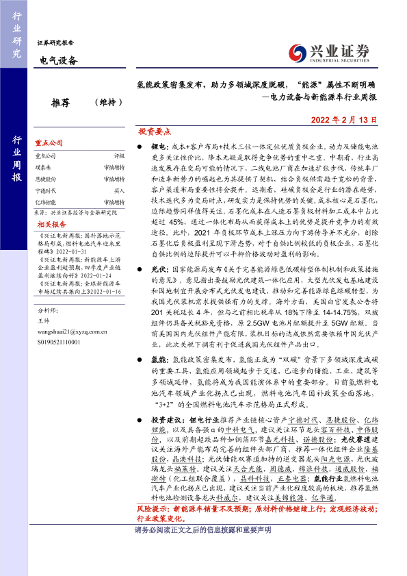 【兴业证券】【20220213】氢能政策密集发布,助力多领域深度脱碳,“能源”属性不断明确 —电力设备与新能源车行业周报-21页