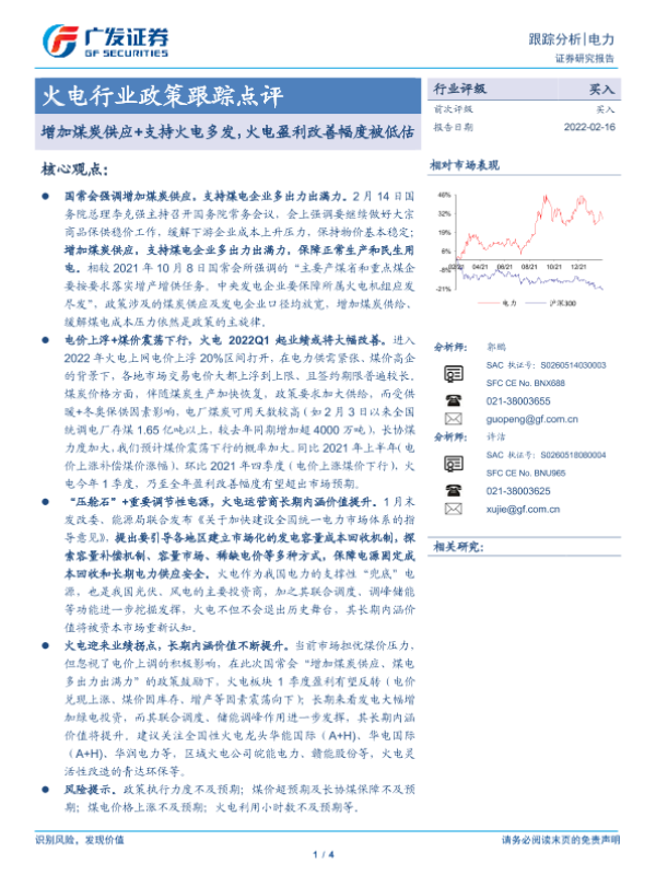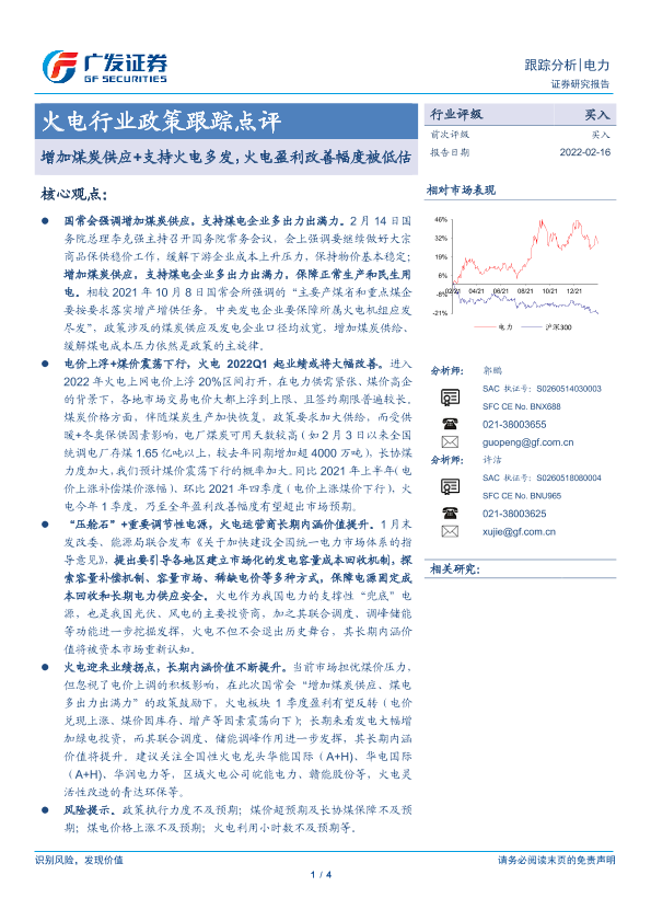 【广发证券】【20220216】火电行业政策跟踪点评:增加煤炭供应+支持火电多发,火电盈利改善幅度被低估-4页