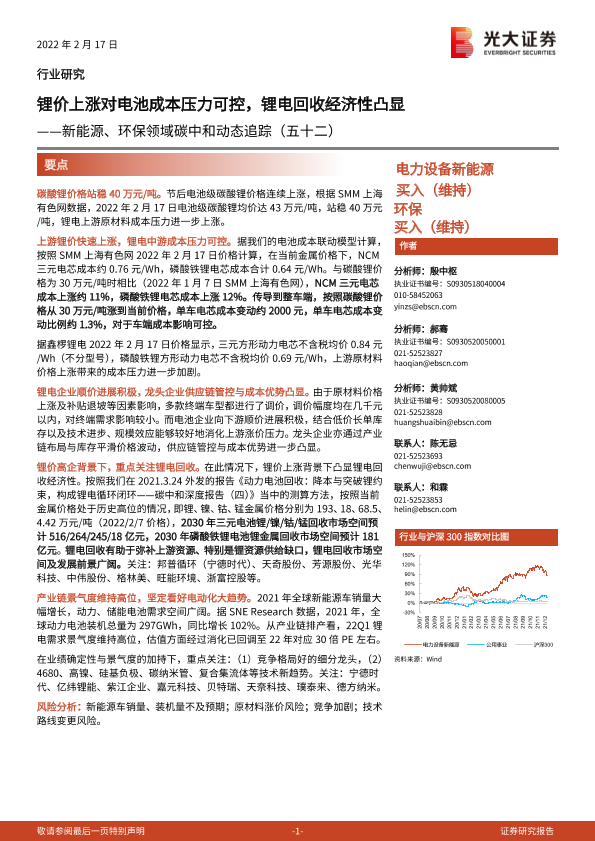 【光大证券】【20220217】新能源、环保领域碳中和动态追踪(五十二):锂价上涨对电池成本压力可控,锂电回收经济性凸显-2页