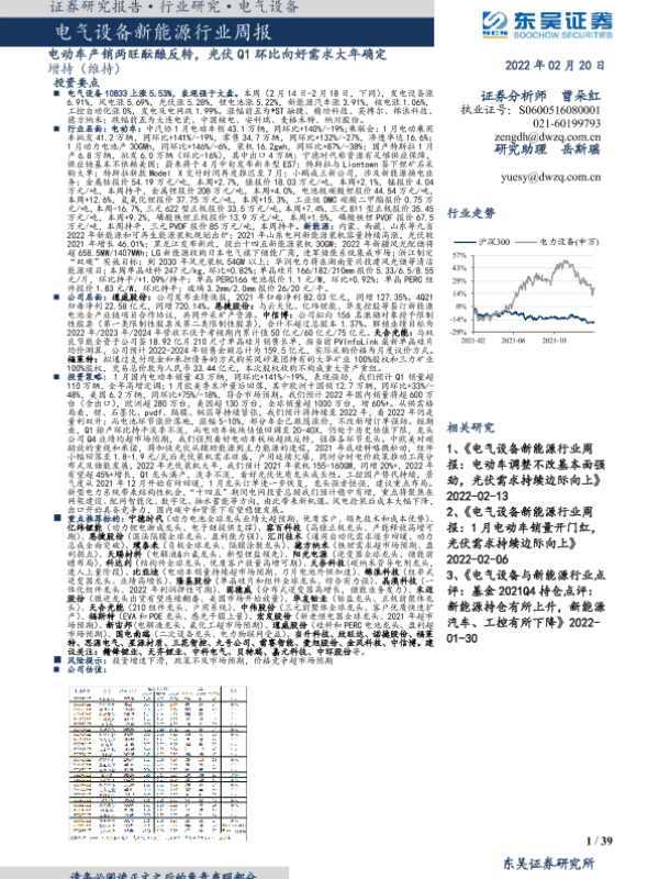 【东吴证券】【20220220】电气设备新能源行业周报:电动车产销两旺酝酿反转,光伏Q1环比向好需求大年确定-39页