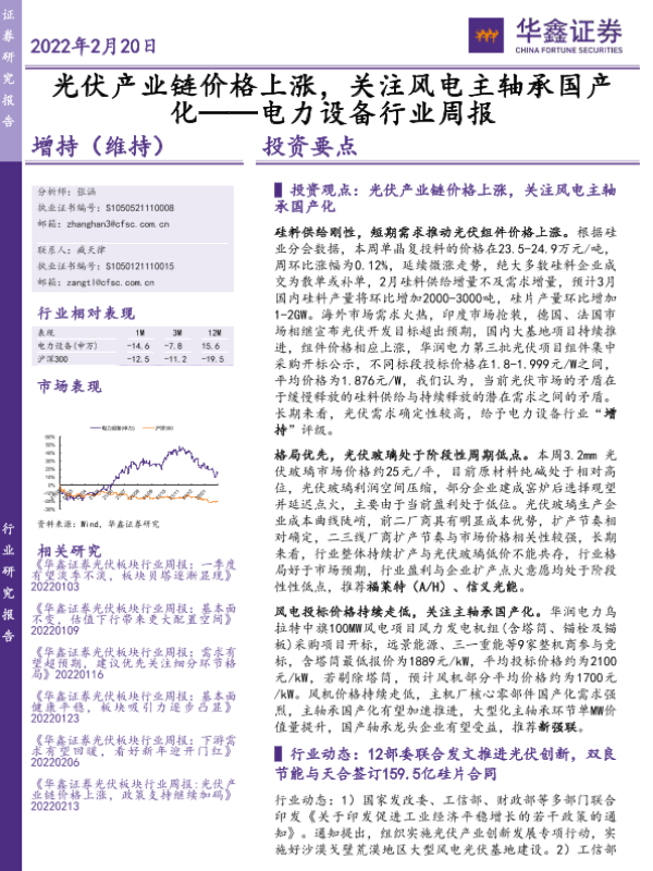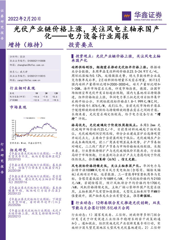 【华鑫证券】【20220220】20220220-华鑫证券-电力设备行业周报:光伏产业链价格上涨,关注风电主轴承国产化-16页