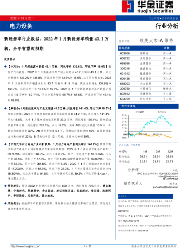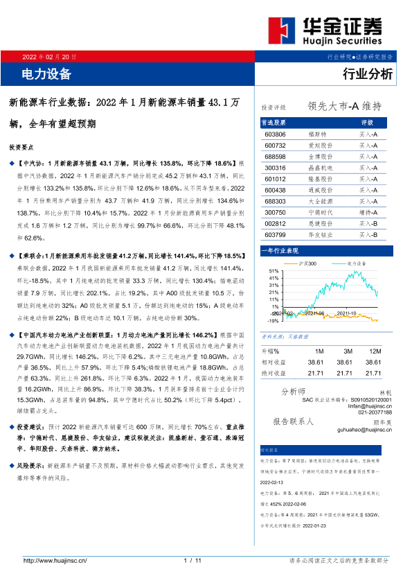 【华金证券】【20220220】电力设备:新能源车行业数据:2022年1月新能源车销量43.1万辆,全年有望超预期-11页