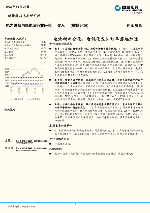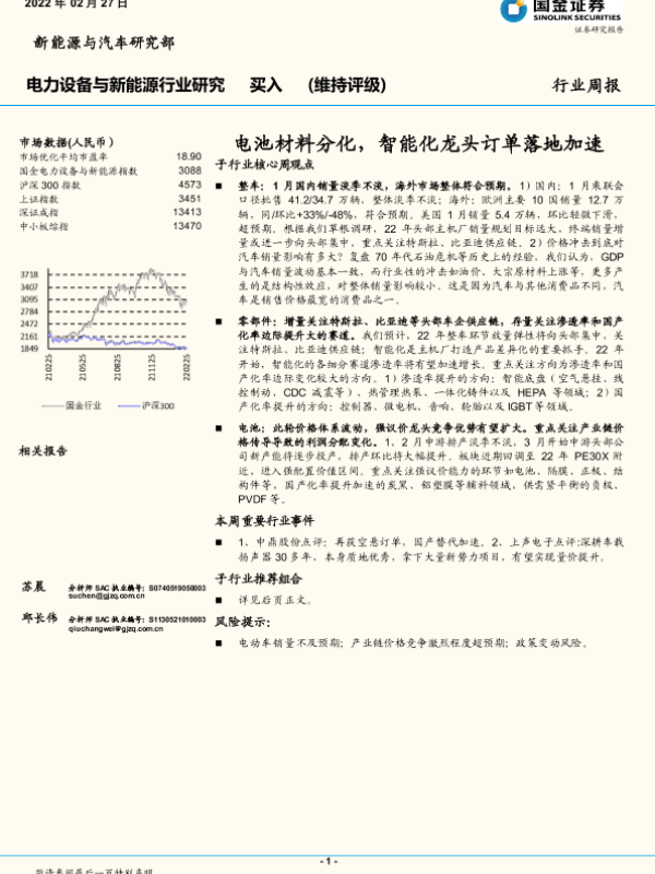 【国金证券】【20220227】电力设备与新能源行业研究:电池材料分化,智能化龙头订单落地加速-10页