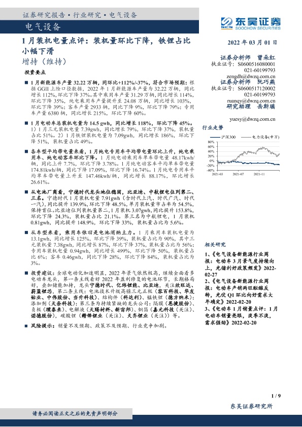 【东吴证券】【20220301】1月装机电量点评:装机量环比下降,铁锂占比小幅下滑-9页