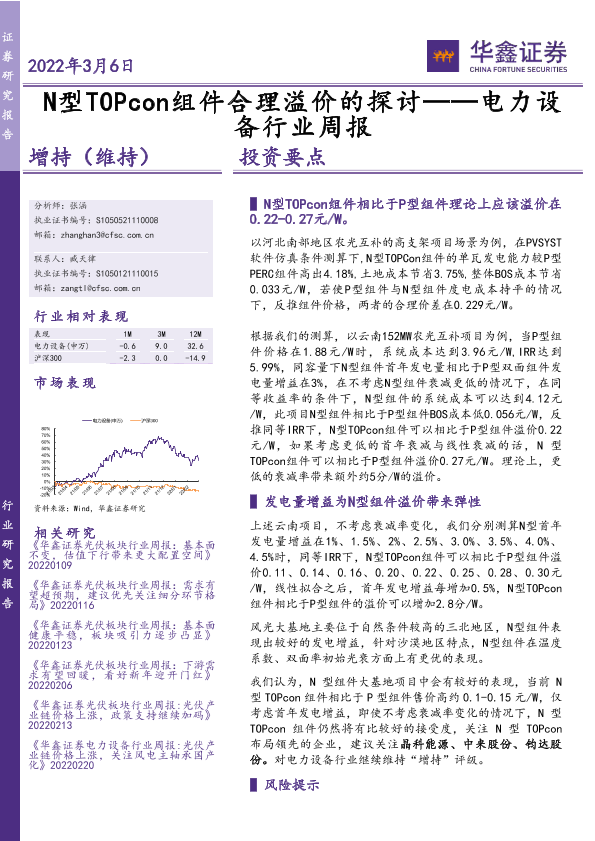 【华鑫证券】【20220306】20220306-华鑫证券-电力设备行业周报:N型TOPcon组件合理溢价的探讨-16页