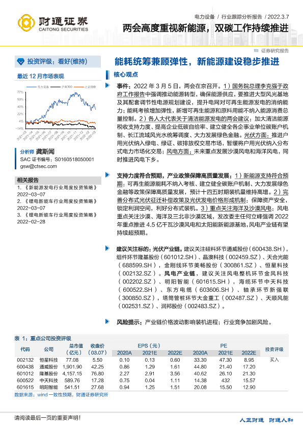 【财通证券】【20220307】电力设备行业跟踪分析报告:两会高度重视新能源,双碳工作持续推进-能耗统筹兼顾弹性,新能源建设稳步推进-2页