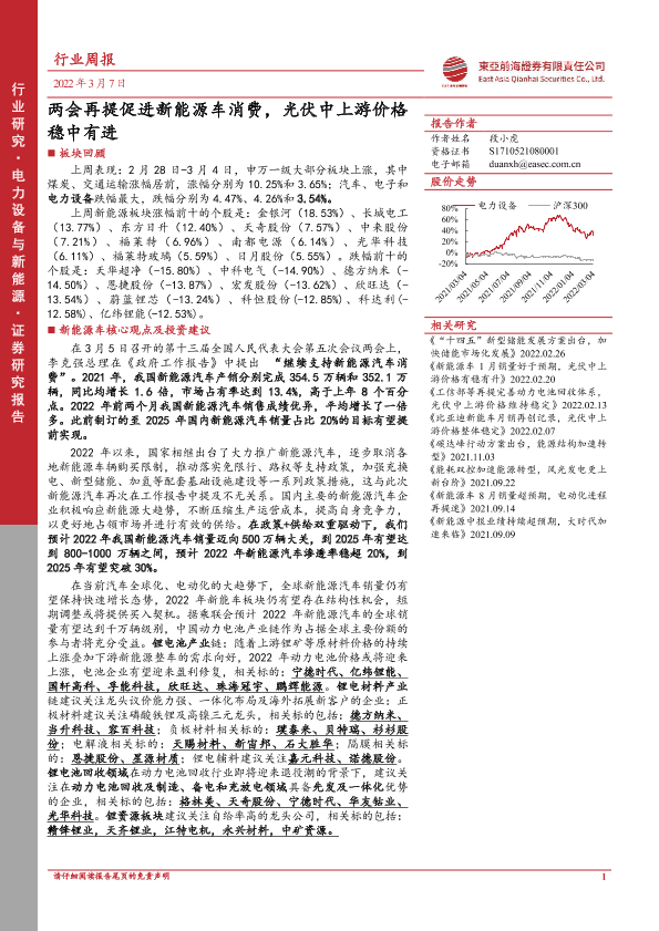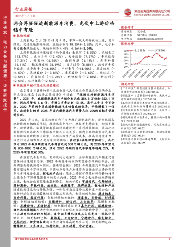 【东亚前海证券】【20220307】电力设备与新能源行业周报:两会再提促进新能源车消费,光伏中上游价格稳中有进-28页