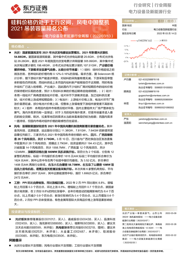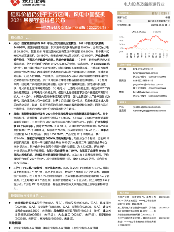 【东方证券】【20220314】电力设备及新能源行业周报:硅料价格仍处于上行区间,风电中国整机2021吊装容量排名公布-16页