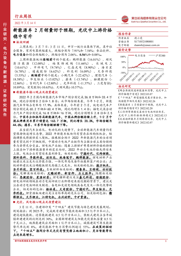 【东亚前海证券】【20220314】电力设备与新能源行业周报:新能源车2月销量好于预期,光伏中上游价格稳中有升-28页