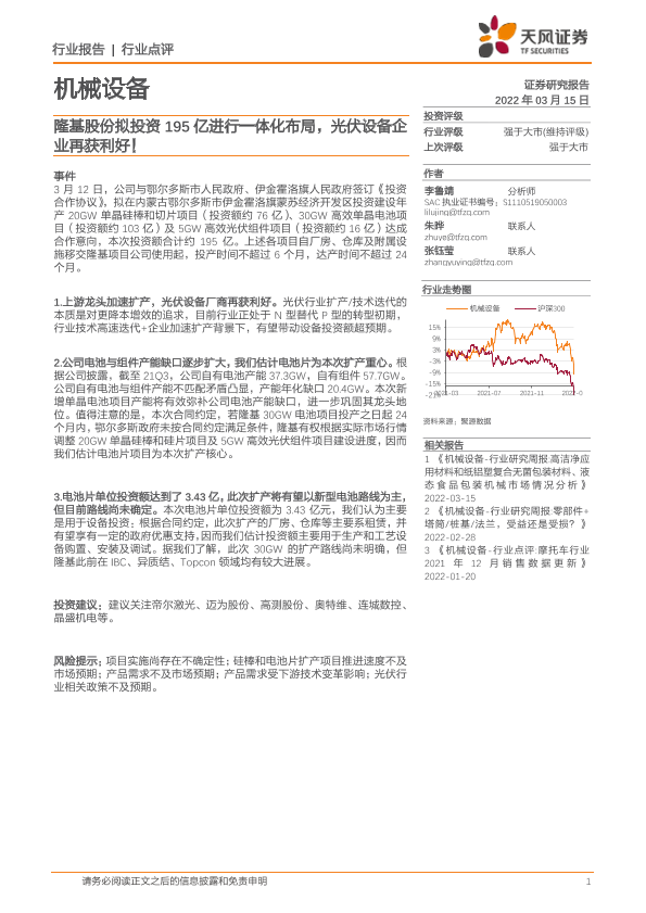 【天风证券】【20220315】隆基股份拟投资195亿进行一体化布局,光伏设备企业再获利好!-2页