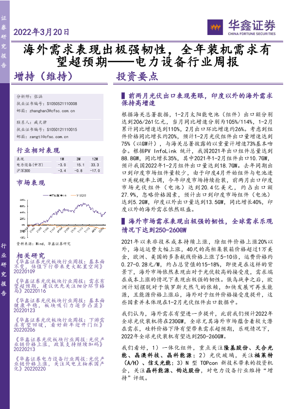 【华鑫证券】【20220320】海外需求表现出极强韧性,全年装机需求有望超预期——电力设备行业周报-17页