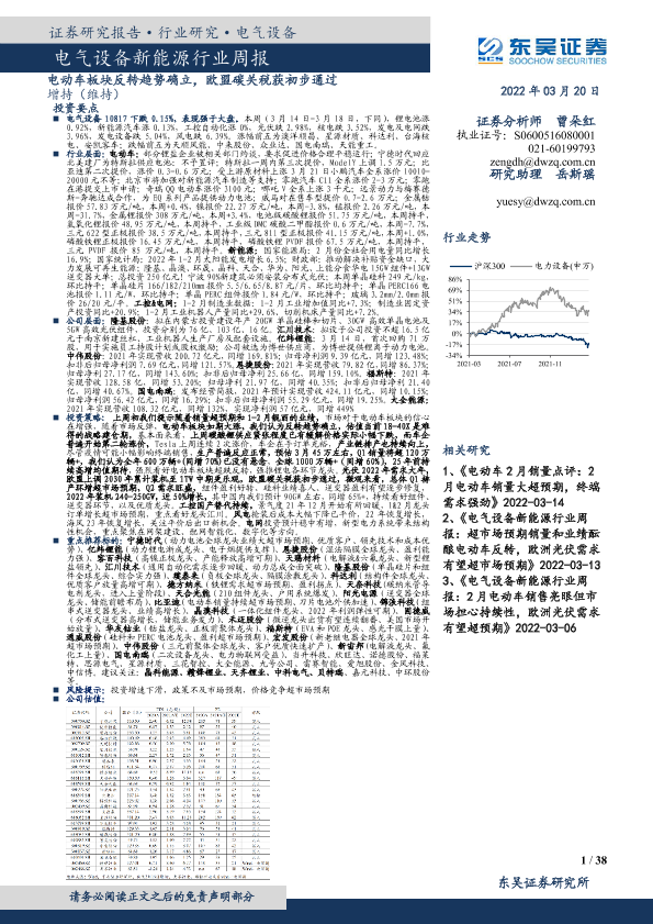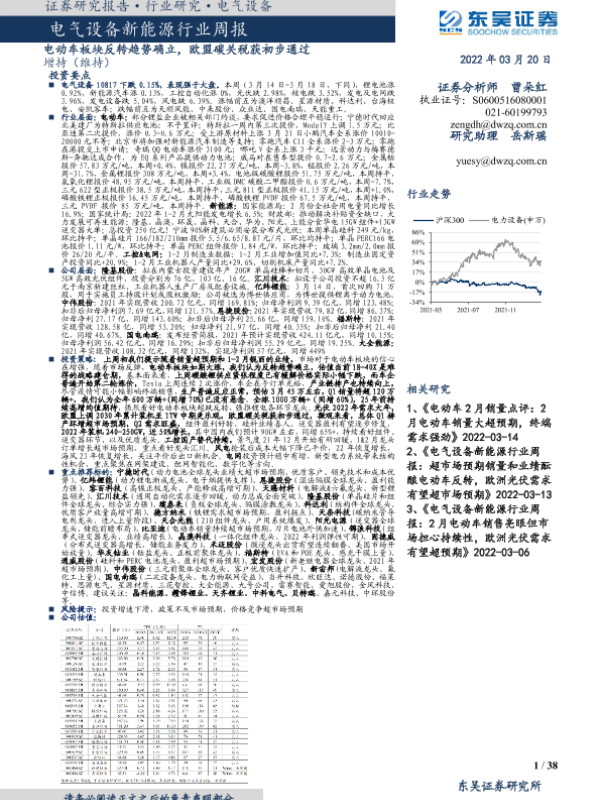 【东吴证券】【20220320】电气设备新能源行业周报:电动车板块反转趋势确立,欧盟碳关税获初步通过-38页