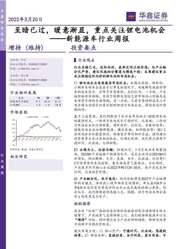 【华鑫证券】【20220320】20220320-华鑫证券-新能源车行业周报:至暗已过,暖意渐显,重点关注锂电池机会-18页