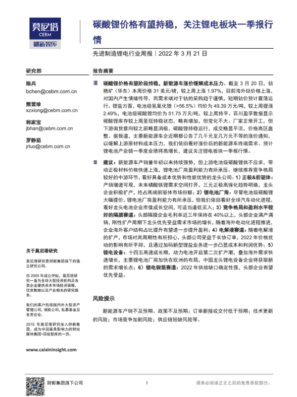 【莫尼塔研究】【20220321】先进制造锂电行业周报:碳酸锂价格有望持稳,关注锂电板块一季报行情-12页