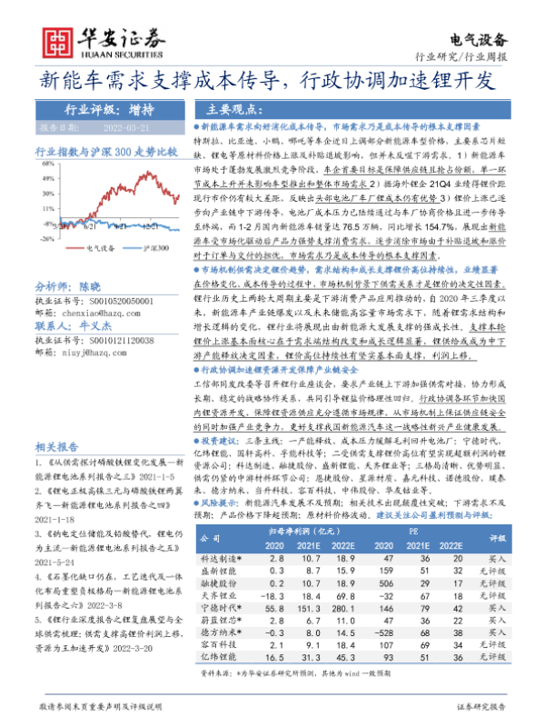 【华安证券】【20220321】20220321-华安证券-电气设备行业周报:新能车需求支撑成本传导,行政协调加速锂开发-22页