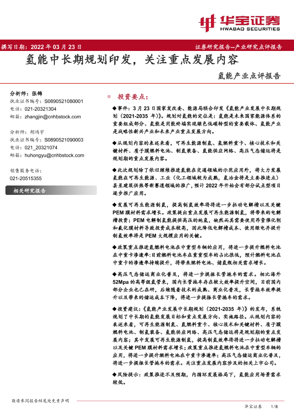 【华宝证券】【20220323】氢能产业点评报告:氢能中长期规划印发,关注重点发展内容-8页