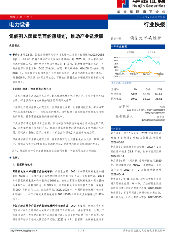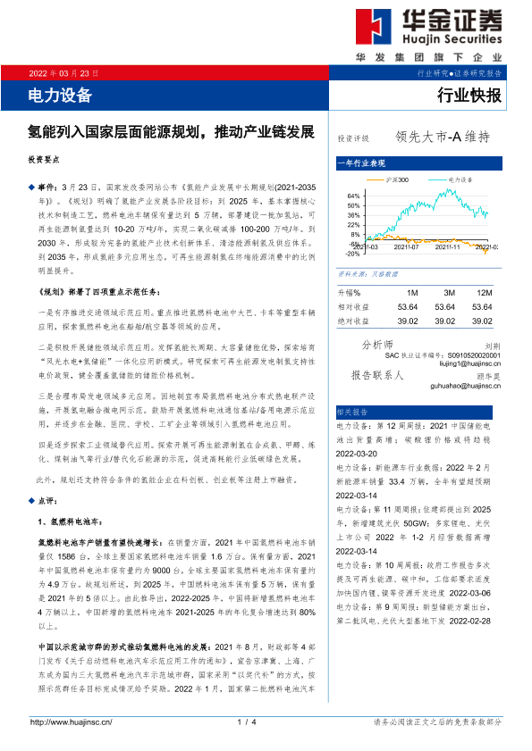 【华金证券】【20220323】电力设备:氢能列入国家层面能源规划,推动产业链发展-4页